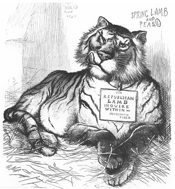 Joseph Keppler and Adolph Schwarzmann launched the English version of the satirical magazine Puck in March of 1877. Keppler was another former artist from Frank Leslie's Illustrated Newspaper and Nast's main rival. Puck gave Keppler a big platform and the advantage of the prominent use of color. On May 29 ,1877 Fletcher Harper died. Harper was Nast's long time advocate at Harper's Weekly. This was a loss that had repercussions for the cartoonist's career. Thomas Nast produced his first cartoon featuring a Lolcat, “The Millennium. The Tiger and the Lamb Lie Together.”