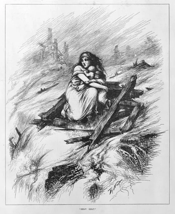 He came back strong on March 1, 1884 with a cartoon titled “Help! Help!” about the desperate need of Cincinnati following a devastating flood and it's aftermath. His next effort was “Sacred Elephant”.